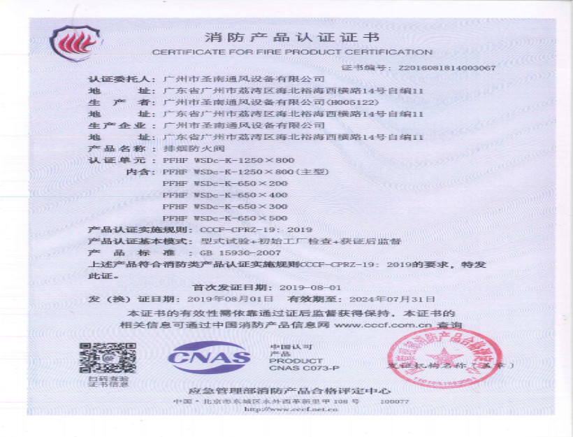排煙防火閥-分型證書PFHF-WSDc -K-1250×800