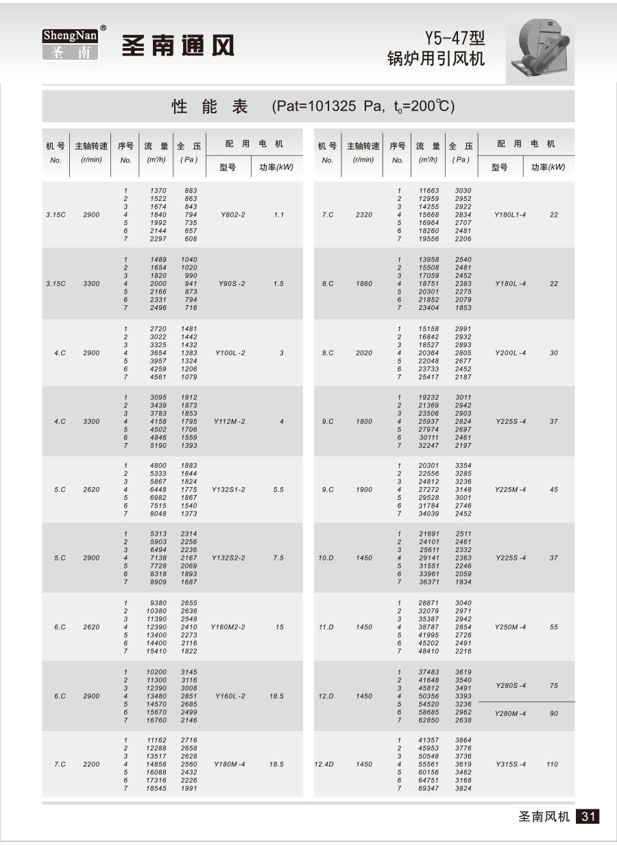 Y5-47型鍋爐離心引風機,是為適應燃用各種煤質并有消煙除塵裝置的(1~20噸/小時)工業鍋爐而聯合設計的最高全壓效率達90.5%的新系列鍋爐引風機。凡進氣條件相當,性能又相適者勻可選用,但最高溫度不得超過250°C。