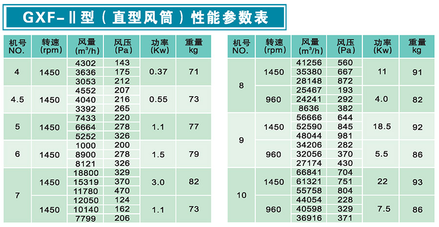 GXF系列風機應用斜流子午加速設計辦法,采用鼓形或直形風筒、錐形輪裁、扭曲翼型葉片結構形式兼有離心式風機壓力系數較高和軸流式風機流量系數較大的特點,具有噪聲低、耗電省、結構緊湊等優點,臥式、立式安裝均可,廣泛適用于大型醫藥、冶金、化工、食品等行業的車間、實驗室送排風系統。可根據輸送介質的要求,制成防腐、防爆型,用于輸送有腐蝕性、易燃易爆的氣體。本系列風機亦可制成屋頂式,表示方法為機號后加字母“W” 。如: GXF-ll-4W。