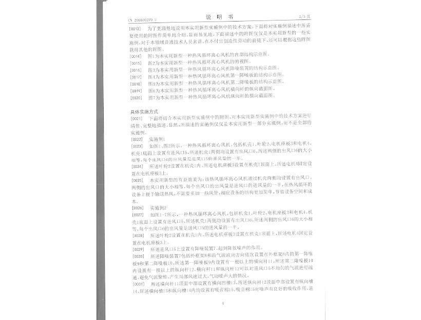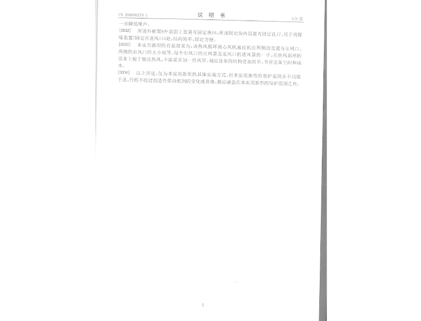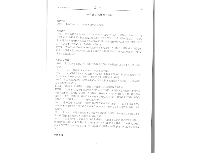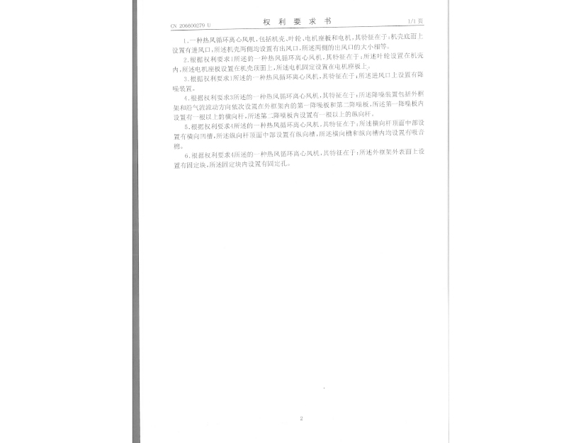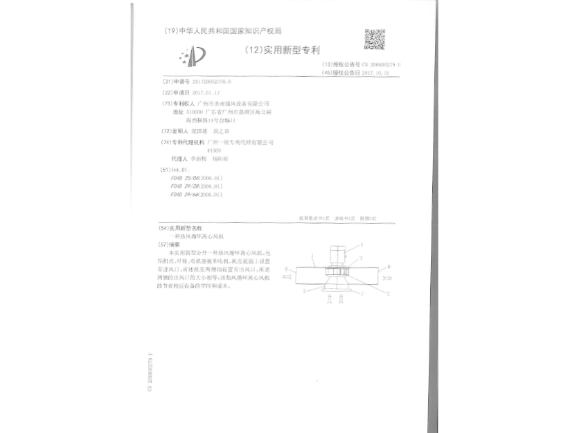 實用新型專利證書 一種熱風循環(huán)離心風機